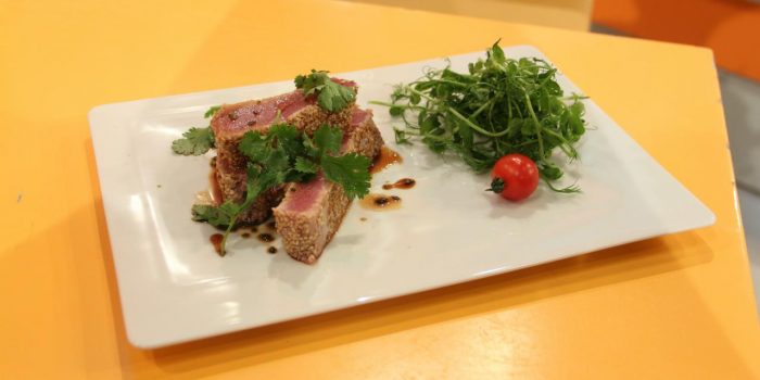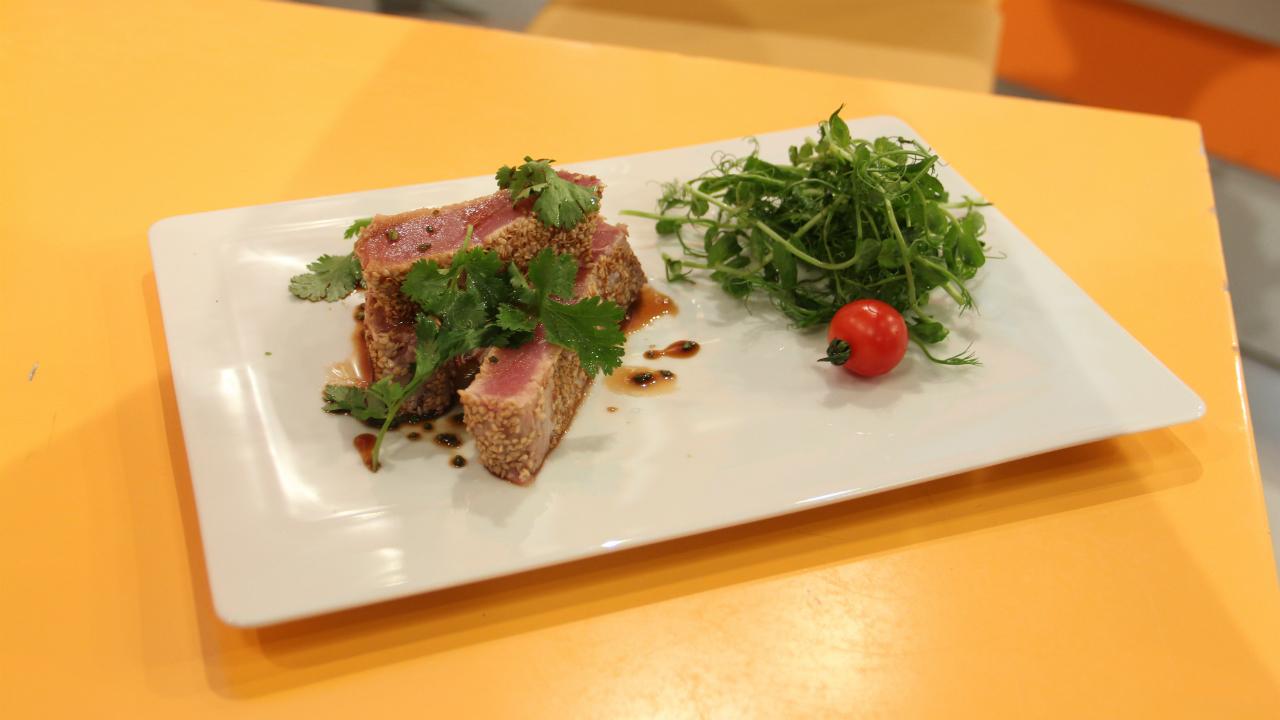 7. Corte o atum em fatias grossas e sirva com salada, folhas de coentros e o molho.