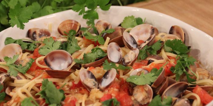 - Junte o linguini cozido misture e verifique o sal. Sirva polvilhado com folhas de coentros ou salsa.
