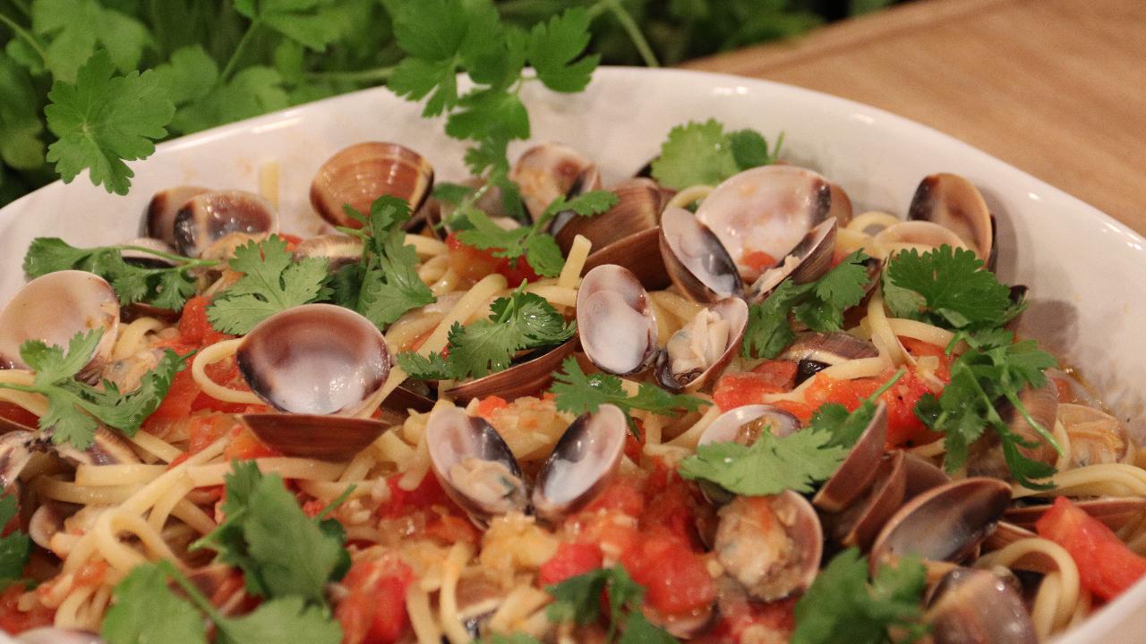 5. Junte o linguini cozido misture e verifique o sal. Sirva polvilhado com folhas de coentros ou salsa.