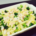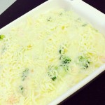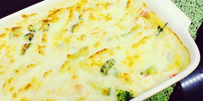 4. Limpe o peixe de pele e espinhas, misture o peixe com a massa, os brócolos, o miolo de camarão e as delícias do mar, cortadas em pedaços pequenos, e deite para um prato de ir ao forno.