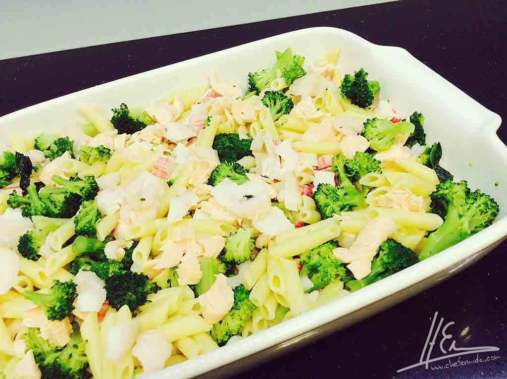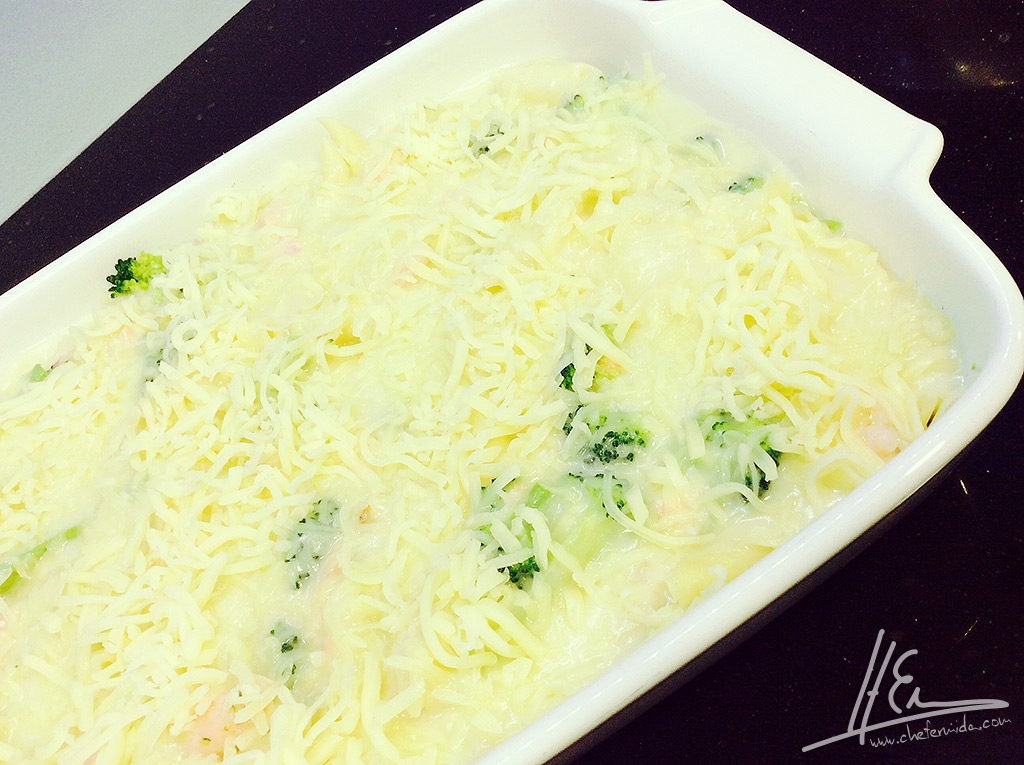 4. Limpe o peixe de pele e espinhas, misture o peixe com a massa, os brócolos, o miolo de camarão e as delícias do mar, cortadas em pedaços pequenos, e deite para um prato de ir ao forno.
