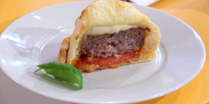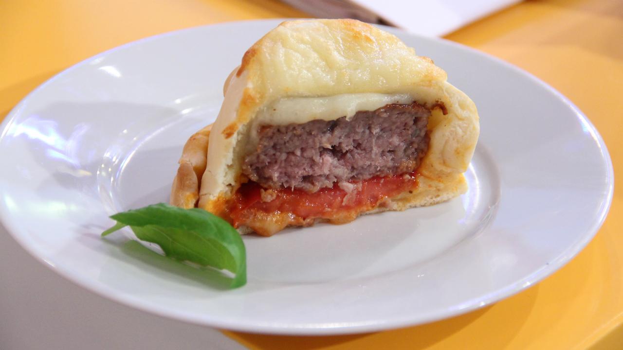 - Coloque no fundo um pouco de queijo, depois uma rodela de tomate, um hambúrguer e molho de tomate. Cubra com outro círculo de massa e feche bem as margens;