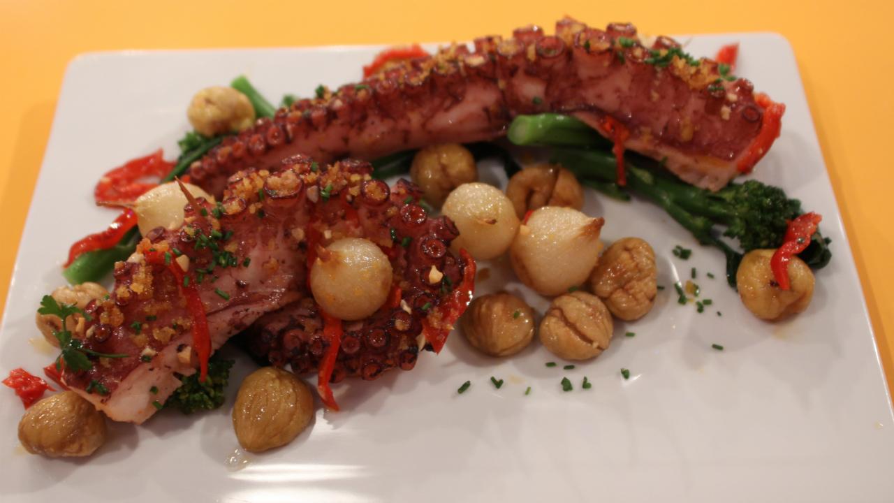 - Coloque o polvo num prato de forno e junte as castanhas, as cebolinhas, o pimento cortado, o alho picado, o louro, a cerveja e regue com azeite