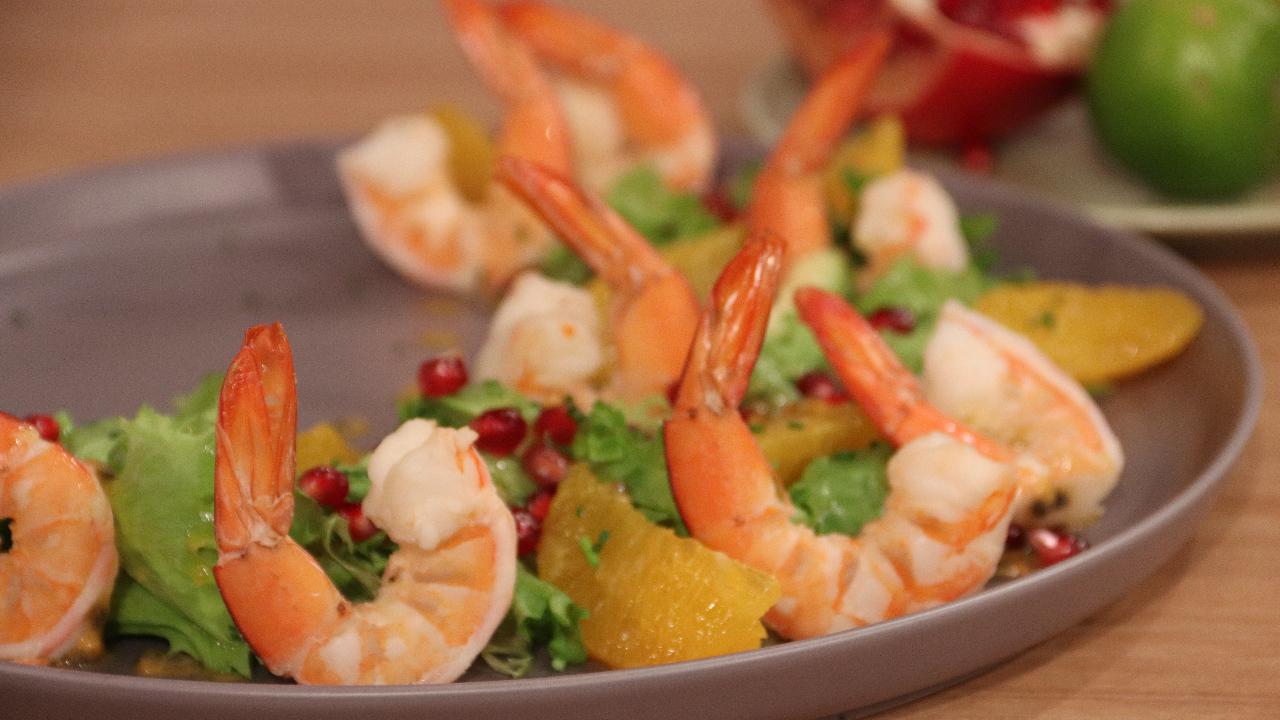 - Divida a alface pelos pratos, junte os gomos de laranja, os camarões cozidos, o bago de romã e regue com o molho. Sirva polvilhado com cebolinho picado.